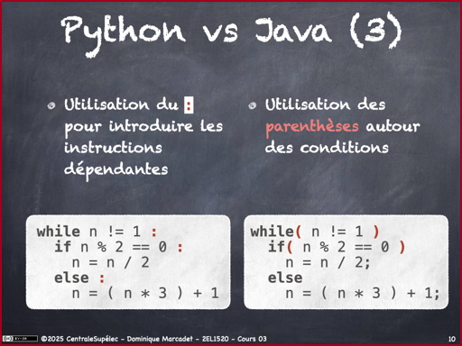 Python impose dans un certain nombre de cas (comme ici après la condition du while, celle du if et après le else) d'utiliser le caractère : ; ce n'est pas nécessaire en Java, mais ce dernier impose par contre l'utilisation de parenthèses ( et ) autour des conditions des instructions de contrôle (c'est aussi issu du langage C).