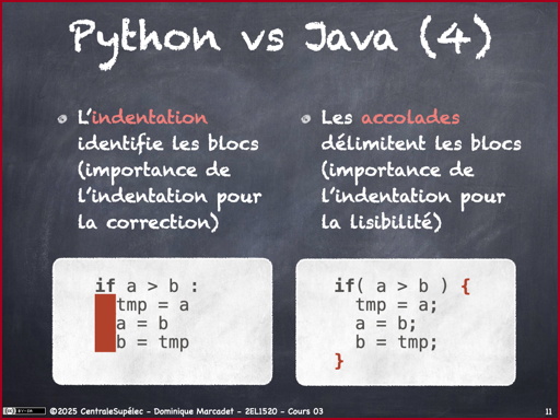 Les caractères « blancs » n'étant pas significatifs en Java, c'est un autre solution que celle de Python qui est utilisée pour indiquer quelle sont les instructions dépendantes d'une instruction de contrôle.