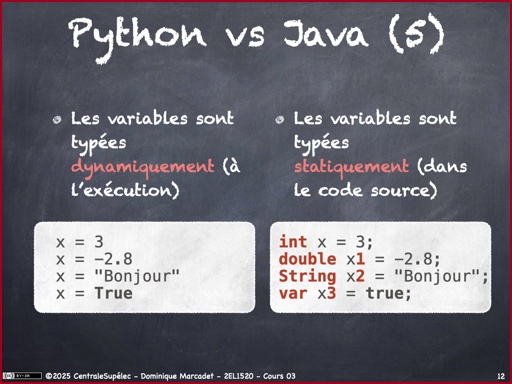 Java est lui typé statiquement : il faut préciser le type de chaque variable, le compilateur vérifie qu'une valeur affectée à une variable est compatible avec le type de celle-ci et interdit les expressions mélangeant de manière incorrecte des données.