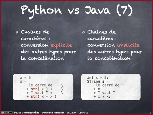 L'opérateur +, en Python comme en Java, permet de concaténer des chaînes de caractères. Il faut par contre, en Python, explicitement convertir en chaînes de caractères les données qui ne sont pas de ce type ; en Java, la conversion est automatique.