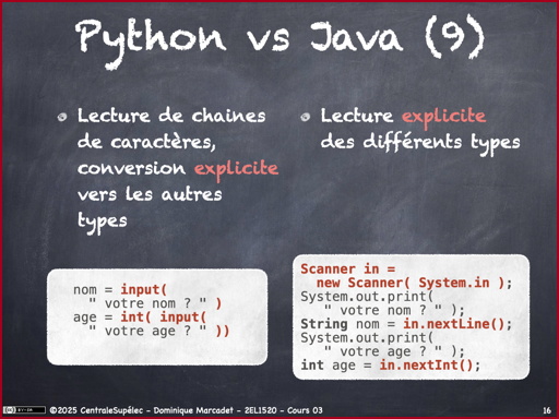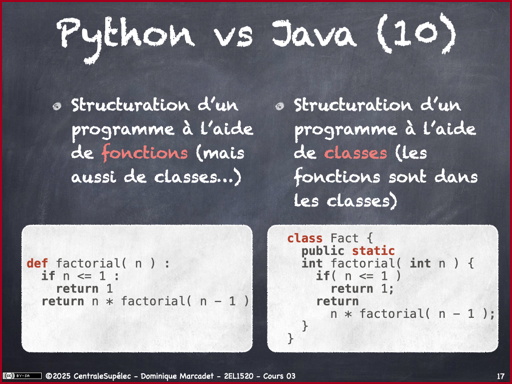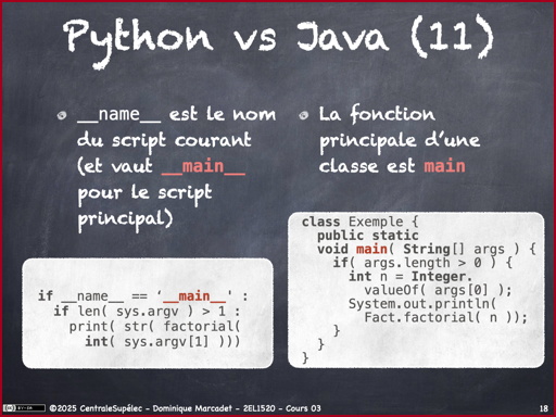 Au niveau principal, un programme Python est en général composé d'un ensemble de fonctions alors que Java est composé d'un ensemble de classes (Python autorise aussi les classes).