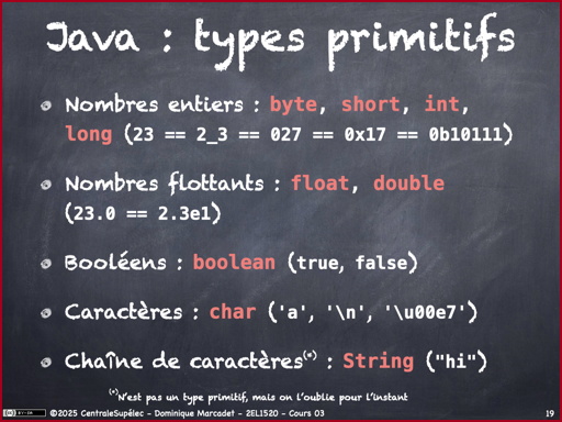 Java propose plusieurs types primitifs pour manipuler des entiers (représentation en complément à 2) : les byte sont sur 8 bits, les short sur 16, les int sur 32 et les long sur 64 ; il existe aussi un type non primitif (une classe, ce concept sera expliqué dans un cours ultérieur), BigInteger, pour des entiers de taille quelconque ; pour les flottants, il existe 2 types primitifs : float sur 32 bits et double sur 64 bits.