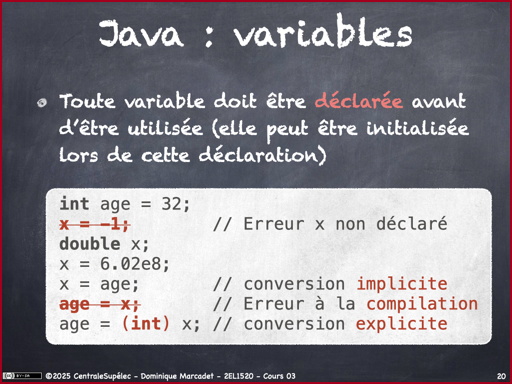 Il n'est donc pas possible de mettre n'importe quelle valeur dans n'importe quelle variable (par exemple, une chaîne de caractères dans une variable entière), l'erreur sera indiquée par le compilateur. Dans certains cas, le compilateur accepte certaines conversions (dites implicites), comme celle d'un entier vers un flottant. Dans d'autres cas, s'il y a potentiellement perte d'information, il faut utiliser une conversion explicite.