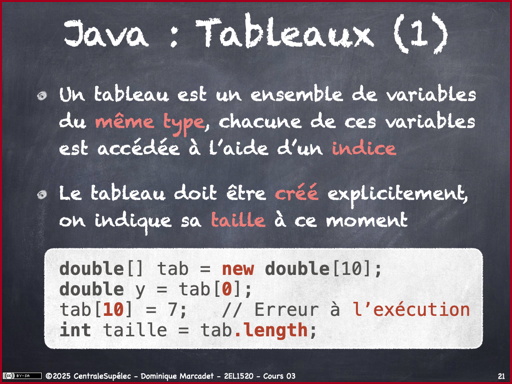 Comme en python, le premier indice valide est 0, Java vérifie à l'exécution que l'indice est valide par rapport à la taille du tableau, cette taille est par ailleurs disponible via la propriété length. Il n'est pas possible de modifier la taille d'un tableau une fois qu'il a été créé (on verra plus tard un autre type qui autorise ce cas d'usage).
