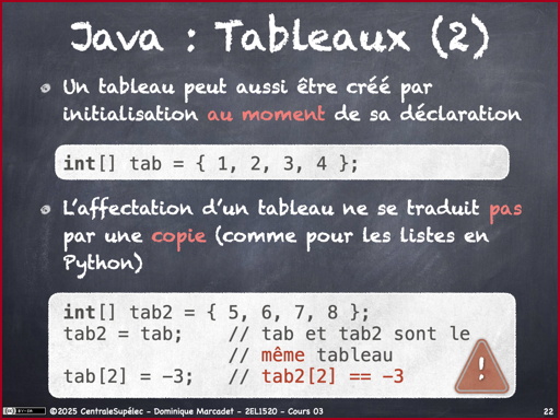 Comme en Python, une variable de sorte tableau ne contient pas directement le tableau, mais un lien vers celui-ci ; comme en Python, l'affectation entre des variables de sorte tableau n'effectue donc pas une recopie des éléments : les 2 variables sont simplement liées au même tableau.