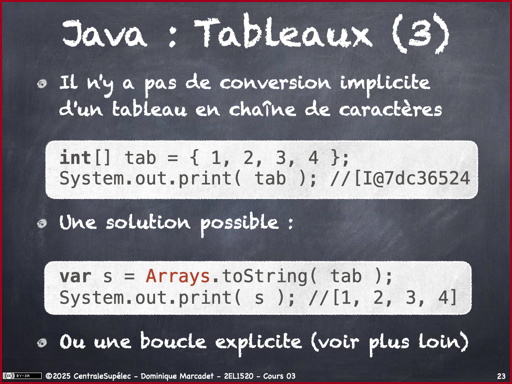 En Java, il faut utiliser println() (ou print() si on ne souhaite pas de retour à la ligne) — une méthode — sur out — un objet qui représente la sortie standard, votre terminal en règle générale ou la console avec Eclipse — accédé dans System — une classe — (tous ces concepts seront expliqués dans un cours à venir) pour effectuer un affichage, en utilisant la syntaxe indiquée sur le transparent.