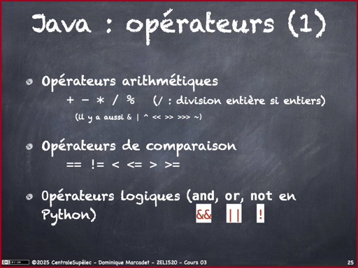 Les opérateurs en Java sont globalement identiques à ceux de Python, avec les règles classiques (par exemple, la multiplication est prioritaire sur l'addition).