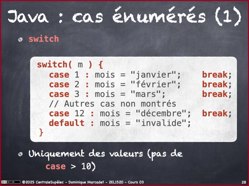 Il ne faut pas oublier le mot-clef break à la fin des instructions qui constituent un case, sinon l'exécution se poursuit au cas suivant (ce comportement est repris lui aussi du langage C).