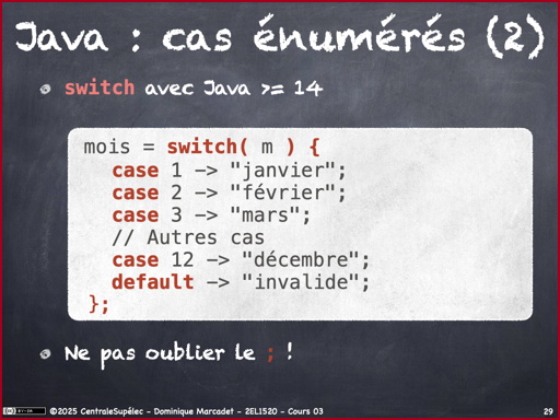 Java 14 a introduit un nouveau switch sous la forme d'une expression, c'est-à-dire conduisant à une valeur. Le break n'est ici pas nécessaire, mais il ne faut pas oublier le ; après l'accolade fermante.