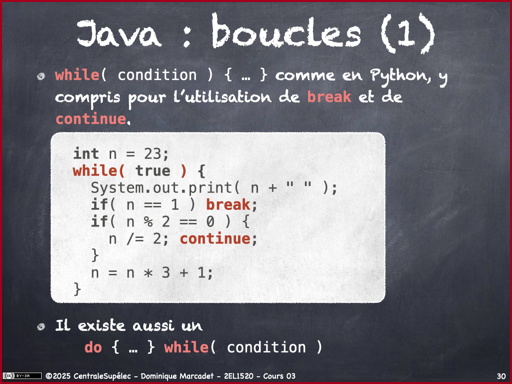 À noter que les instructions break (sortir de la boucle courante) et continue (passer immédiatement à l'itération suivante) existent aussi en Java.