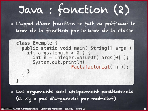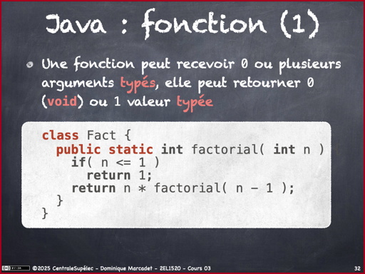 L'équivalent d'une fonction Python est en Java une méthode statique : sans donner plus d'explications qui viendront dans un cours ultérieur, on peut dire qu'une méthode est une fonction définie à l'intérieur d'une classe (ici la fonction factorial dans la classe MathUtils), elle est qualifiée de statique de par l'utilisation du mot clef static. Notons l'utilisation du mot clef public qui sera lui aussi expliqué par la suite.