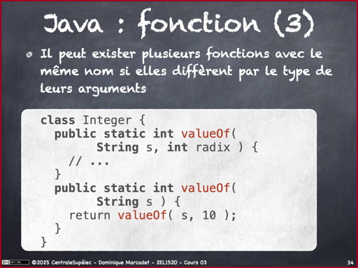 Notez que Java ne propose que des arguments positionnels, pas d'argument par mot-clef. On appelle signature l'ensemble constitué du nom de la fonction et du type des arguments (donc sans tenir compte du nom des arguments).
