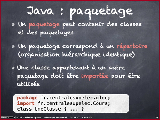Ici, le fichier UneClasse.java devra être dans un dossier gloo, lui même contenu dans un dossier centralesupelec (où se trouvera le fichier Cours.java), enfin ce dernier sera dans un dossier fr.
