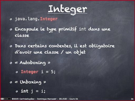 Un paramètre de généricité est obligatoirement une classe, c'est pour cela qu'il faut utiliser Integer et pas int. Il n'est pas nécessaire d'indiquer ce paramètre de généricité dans l'expression qui suite le new si cette information est déjà présente dans le type de la variable.