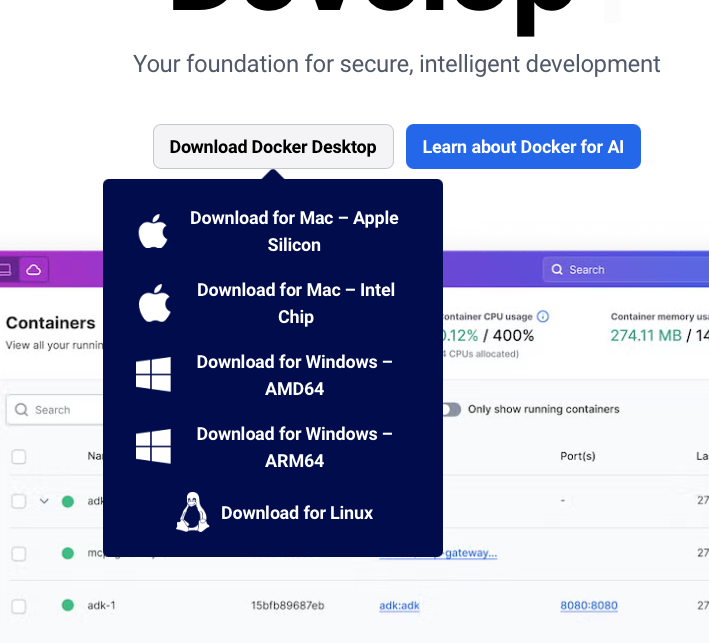- Aller sur la page Docker Desktop pour télécharger l'installateur correspondant à votre PC: