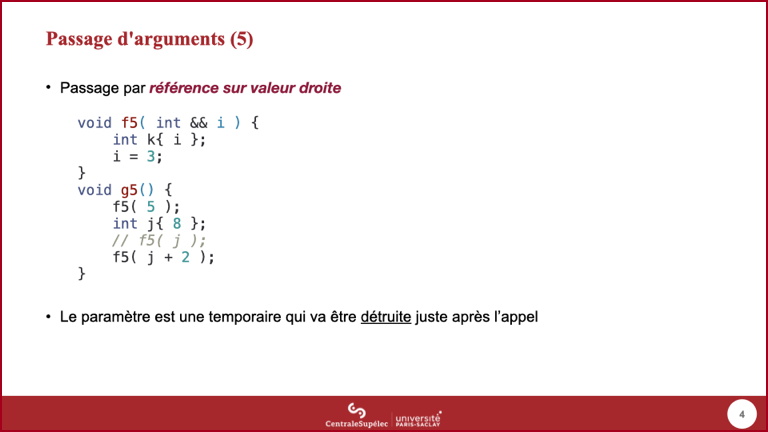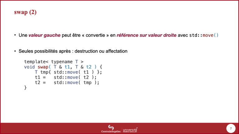 - Pour le passage d'arguments, l'utilisation d'une référence sur valeur droite signale que l'argument reçu va être détruit juste après.