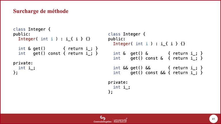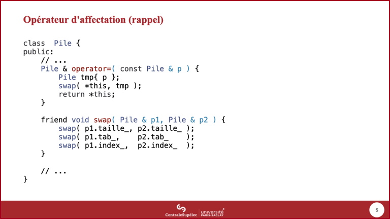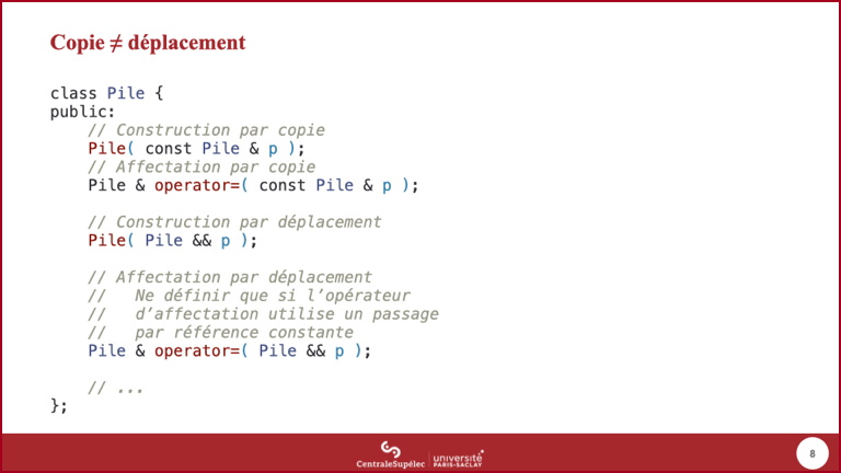 - À noter que si l'affectation par copie utilise un passage par valeur, une définition d'une affectation par déplacement entraine une erreur d'ambiguïté signalée par le compilateur.