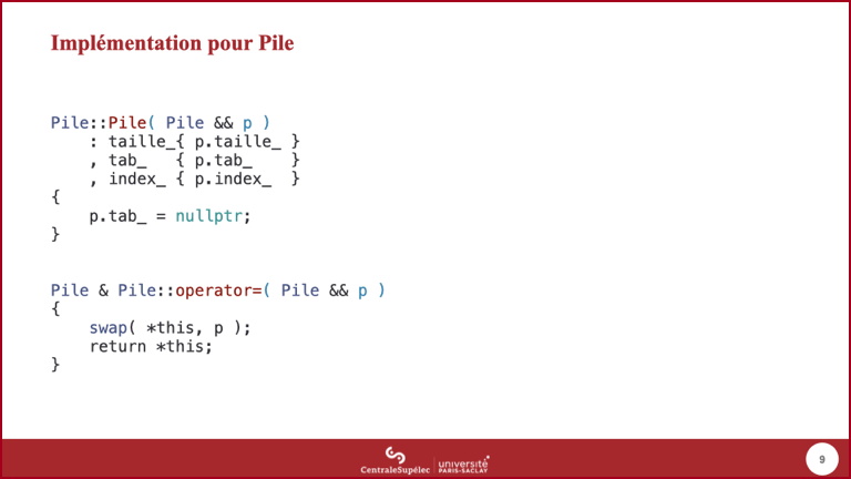 - Dans le cas de notre pile, on comprend facilement l'intérêt de les définir : la pile reçue en argument va être détruite juste après, donc on peut lui « voler » sa représentation au lieu d'en faire une copie.