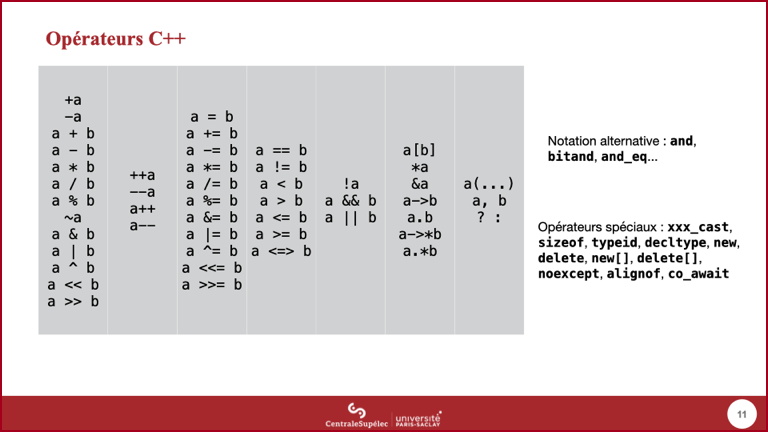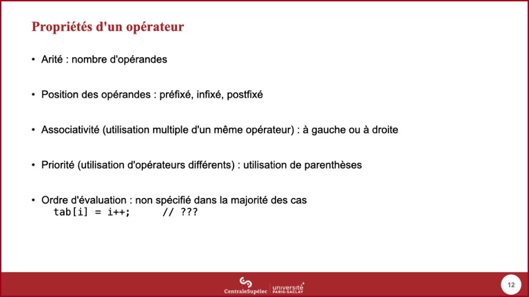 ++et--qui existent en préfixé et en postfixé. - La majorité des opérateurs sont associatifs à gauche, l'opérateur d'affectation