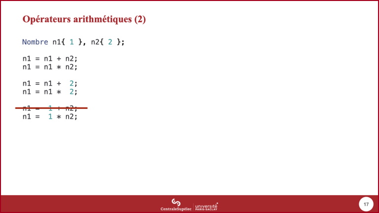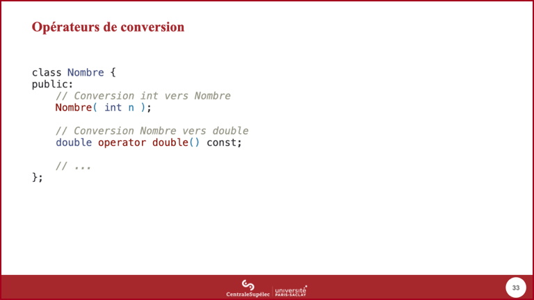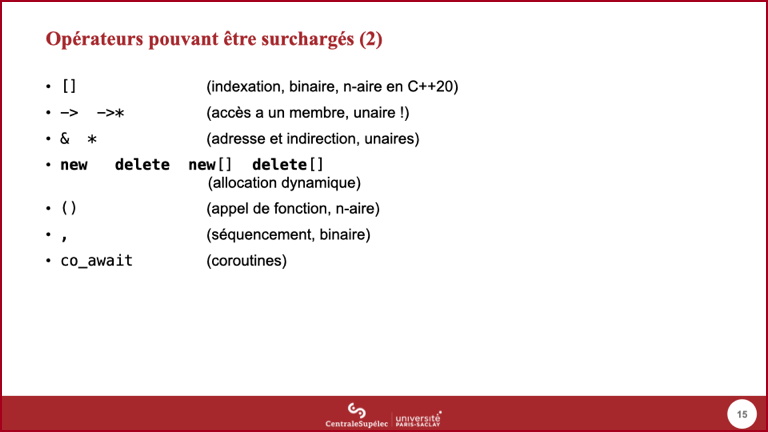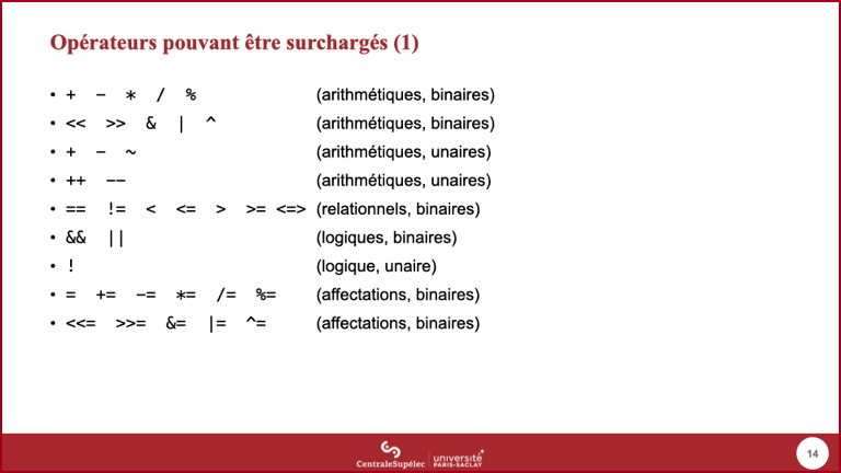 - Le langage C++ permet la surcharge de la majorité des opérateurs ; au moins l'un des opérandes doit être d'un type utilisateur : classe ou énumération.