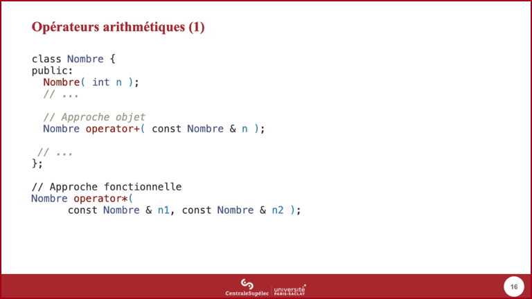 - Pour les opérateurs arithmétiques, le programmeur a le choix entre l'approche objet et l'approche fonctionnelle.