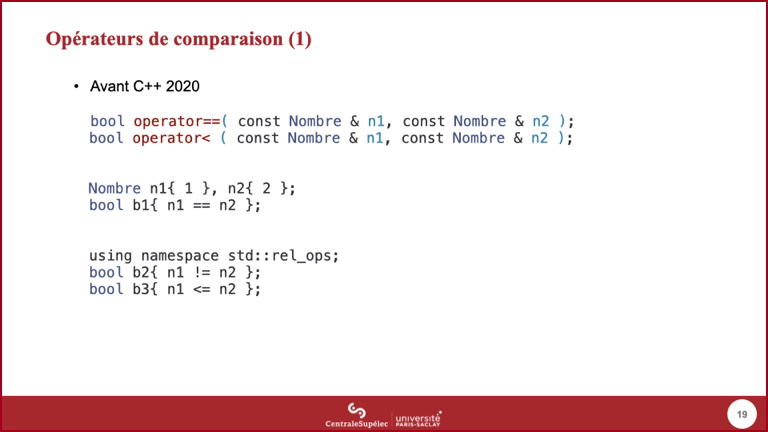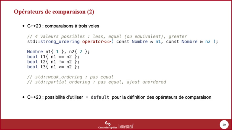 <=>a été introduit par la version 2020 du standard du langage C++. C'est un opérateur binaire permettant de déterminer en une seule instruction si les deux opérandes sont égaux, si l'un est plus petit, ou s'ils sont incomparables (voir plus loin). - Les opérateurs