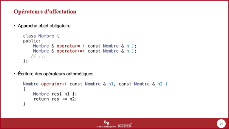 - Les affectations composées doivent aussi obligatoirement utiliser l'approche objet, elles permettent ensuite de définir facilement les opérateurs arithmétique binaires sous forme fonctionnelle sans avoir besoin de les déclarer amis.