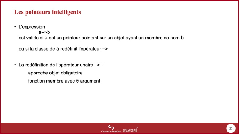 ->est un opérateur unaire ; en effet, dans l'expressiona->b, seulaest évalué,best le nom du membre accédé. - Sa surcharge permet d'utiliser des objets qui se comportent comme des pointeurs ; on parle de pointeurs intelligents (smart pointers).