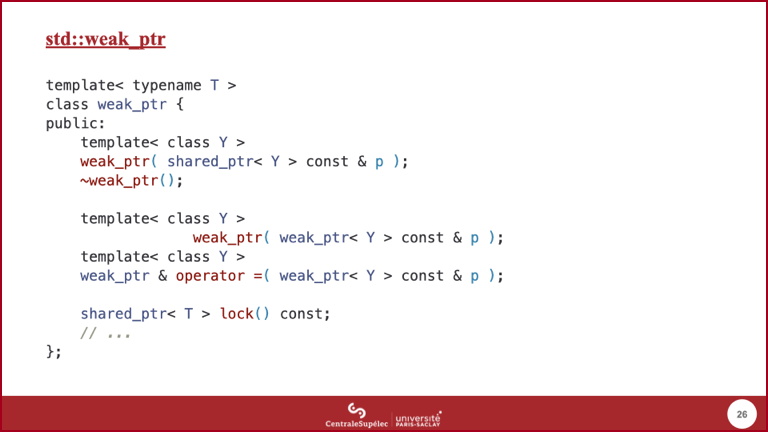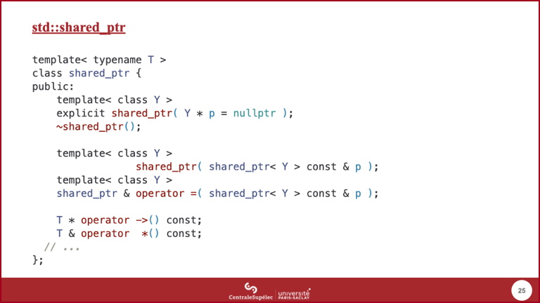 std::shared_ptroffre la connaissance partagée : un objet peut être connu par plusieurs, il continue d'exister tant qu'il existe au moins un autre objet qui le connait, il est détruit quand il n'est plus connu de personne.- Son implémentation se fait classiquement avec un compteur de références.