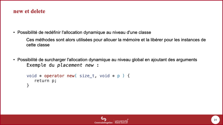 new) ou l'adresse de la zone à libérer (pourdelete) ; en particulier, la bibliothèque contient une version, dite placement new, qui reçoit un pointeur générique comme argument supplémentaire et qui ce contente de le retourner : cette astuce permet d'imposer la zone mémoire où un objet sera mémorisé en conservant les bénéfices de la création de l'objet, en particulier l'appel d'un constructeur.