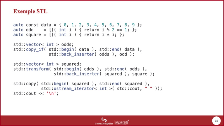 - Cet exemple, qui n'utilise pas cette nouvelle bibliothèque, affiche les carrés des éléments impairs d'une séquence existante.